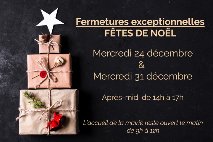 Nous vous informons que l'accueil de la mairie sera fermé le 24 et 31 décembre après-midi.