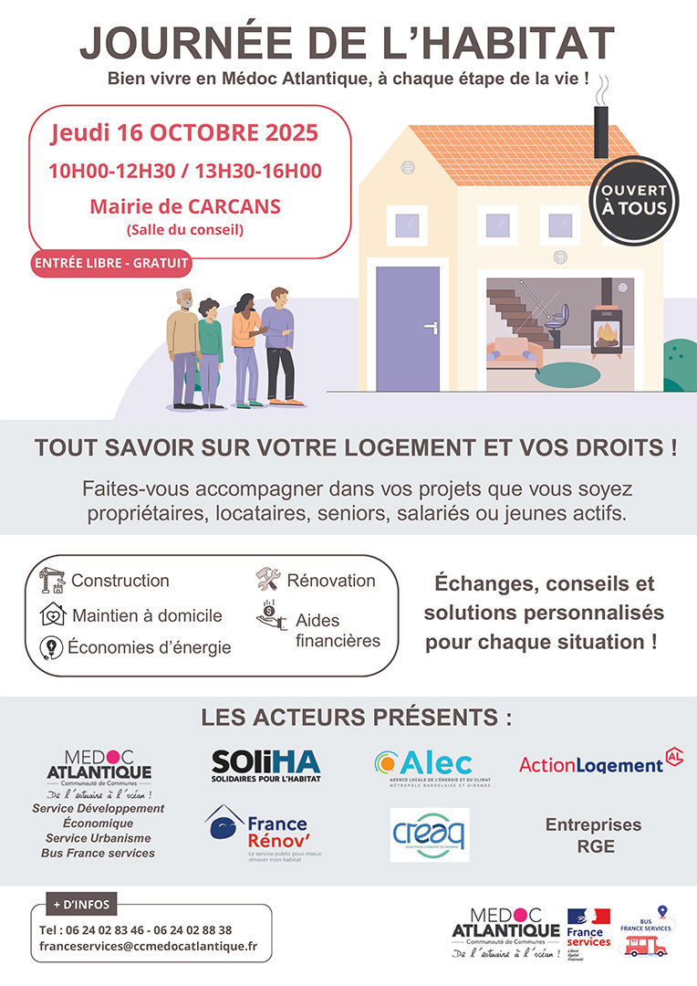 En partenariat avec la Communauté de Communes Médoc Atlantique, nous vous proposons de participer jeudi 16 octobre 2025, une Journée de l’Habitat destinée à tous ceux qui souhaitent s’informer et être accompagnés dans leurs projets de logement.