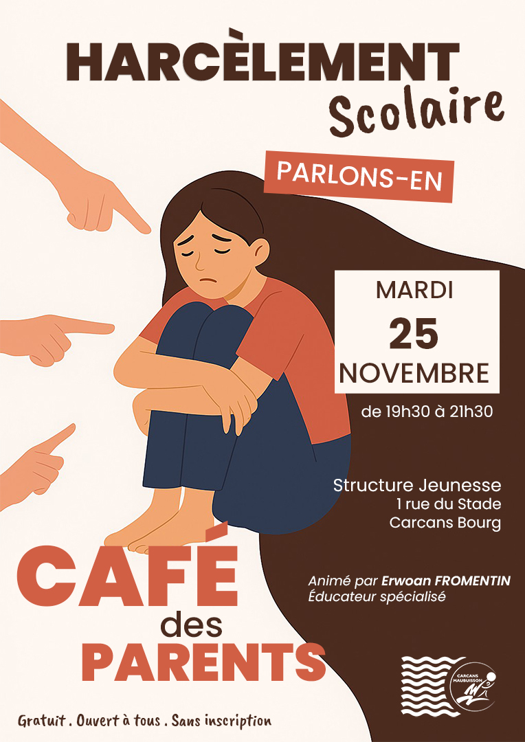 Le mardi 26 novembre, de 19h30 à 21h30, la Structure Jeunesse de Carcans Bourg accueille un Café des Parents autour d’un sujet essentiel : le harcèlement scolaire.