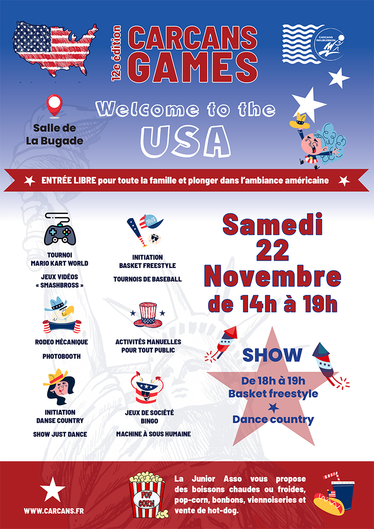 Cette année, Carcans Game revient pour une édition haute en couleurs sur le thème « USA » ! L’événement, attendu par petits et grands, promet une journée festive et pleine de défis à la salle de la Bugade, le samedi 22 novembre de 14h à 19h.