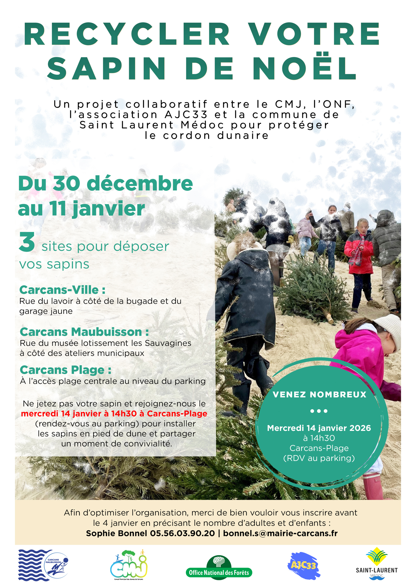 Donc, ne jetez pas votre sapin, déposez le sur un lieu de stockage et rejoignez nous le mercredi 14 janvier à Carcans Plage (accès sud, à côté du parking à vélos) pour installer les sapins en pied de dune et partager un moment de convivialité.