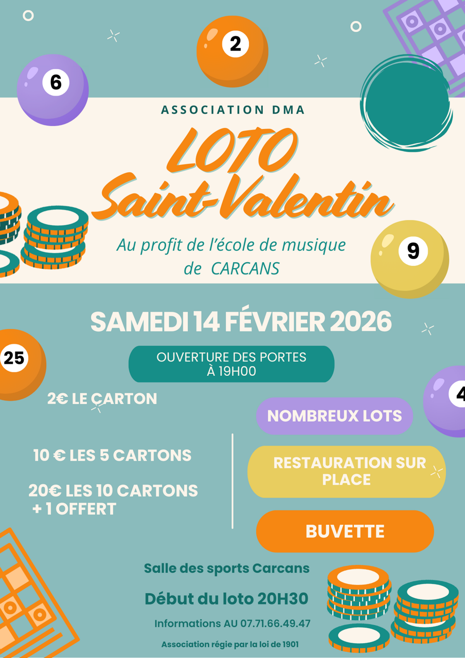 L’association DMA organise un loto de la Saint Valentin le samedi 14 février 2026 à la salle des Sports de Carcans Bourg, un événement festif ouvert à tous, petits et grands, qui promet une après-midi riche en émotions et en surprises.