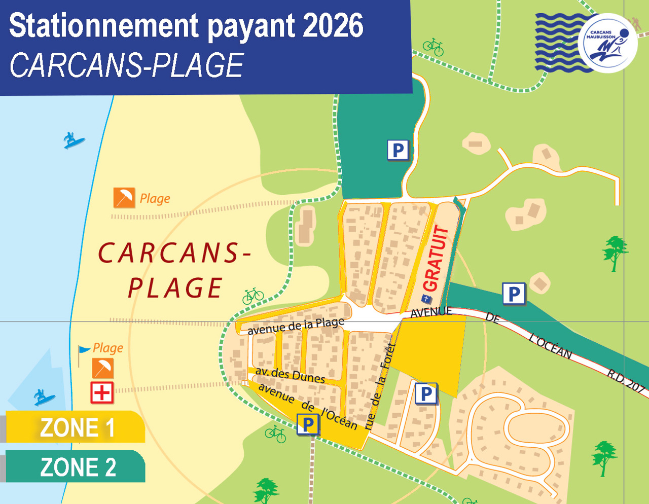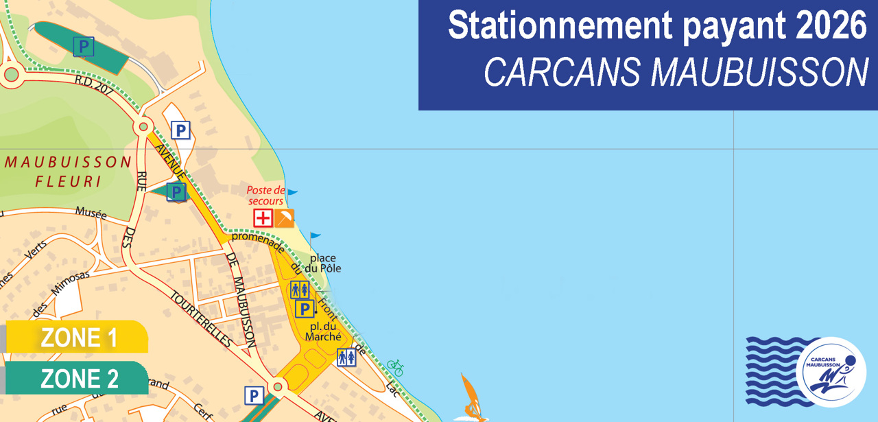 Le stationnement est gratuit à Carcans sauf du 1er mai au 30 septembre, dans certains secteurs de Maubuisson et Carcans-Plage où un forfait de stationnement est mis en place.